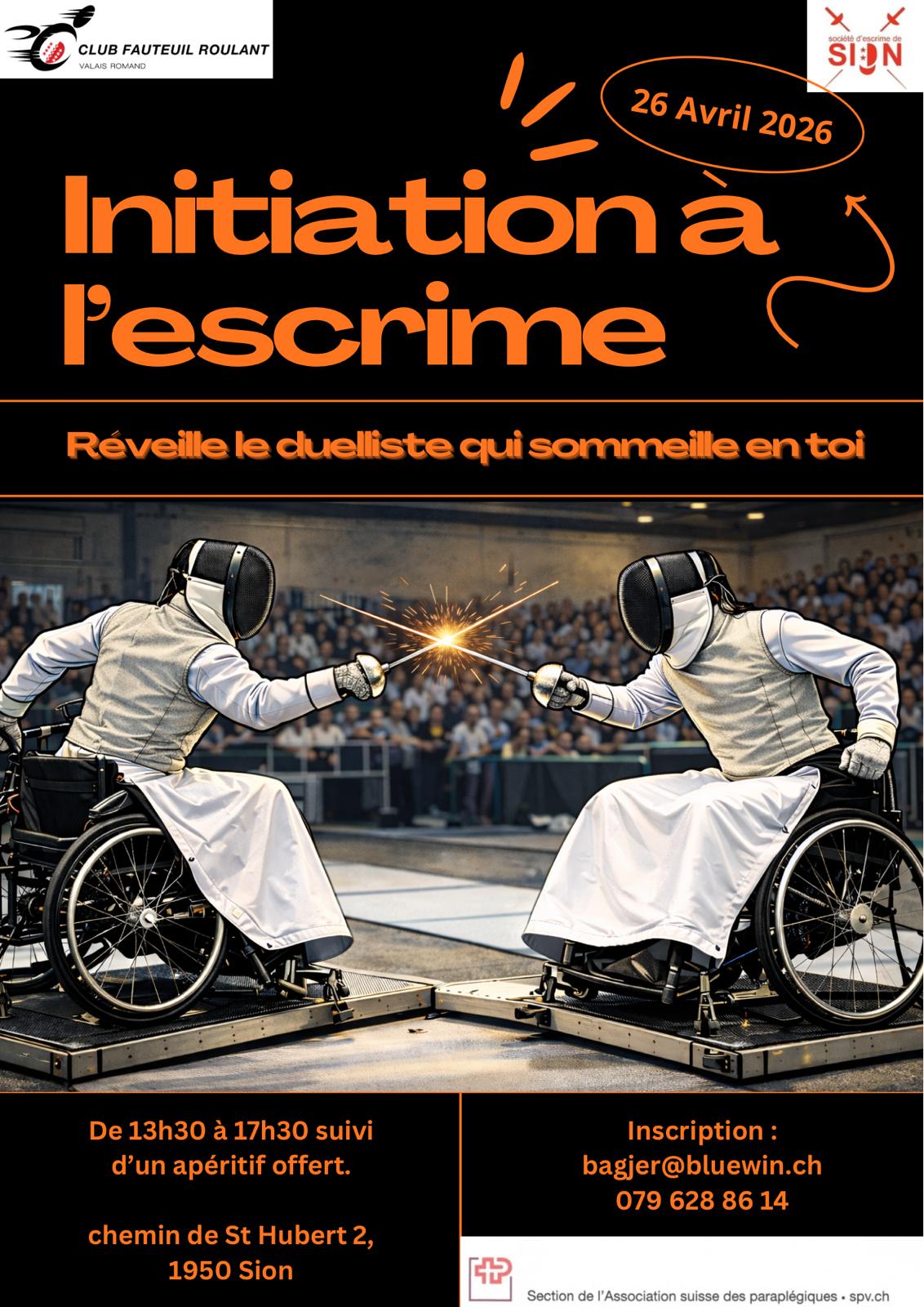 Quel plaisir de vous informer qu’une initiation à l’escrime en fauteuil se déroulera à la salle d’armes (Site EPTM) à Sion, le dimanche 26 avril 2026 de 13h30 à 17h30. Celle-ci sera suivi d’un apéro.