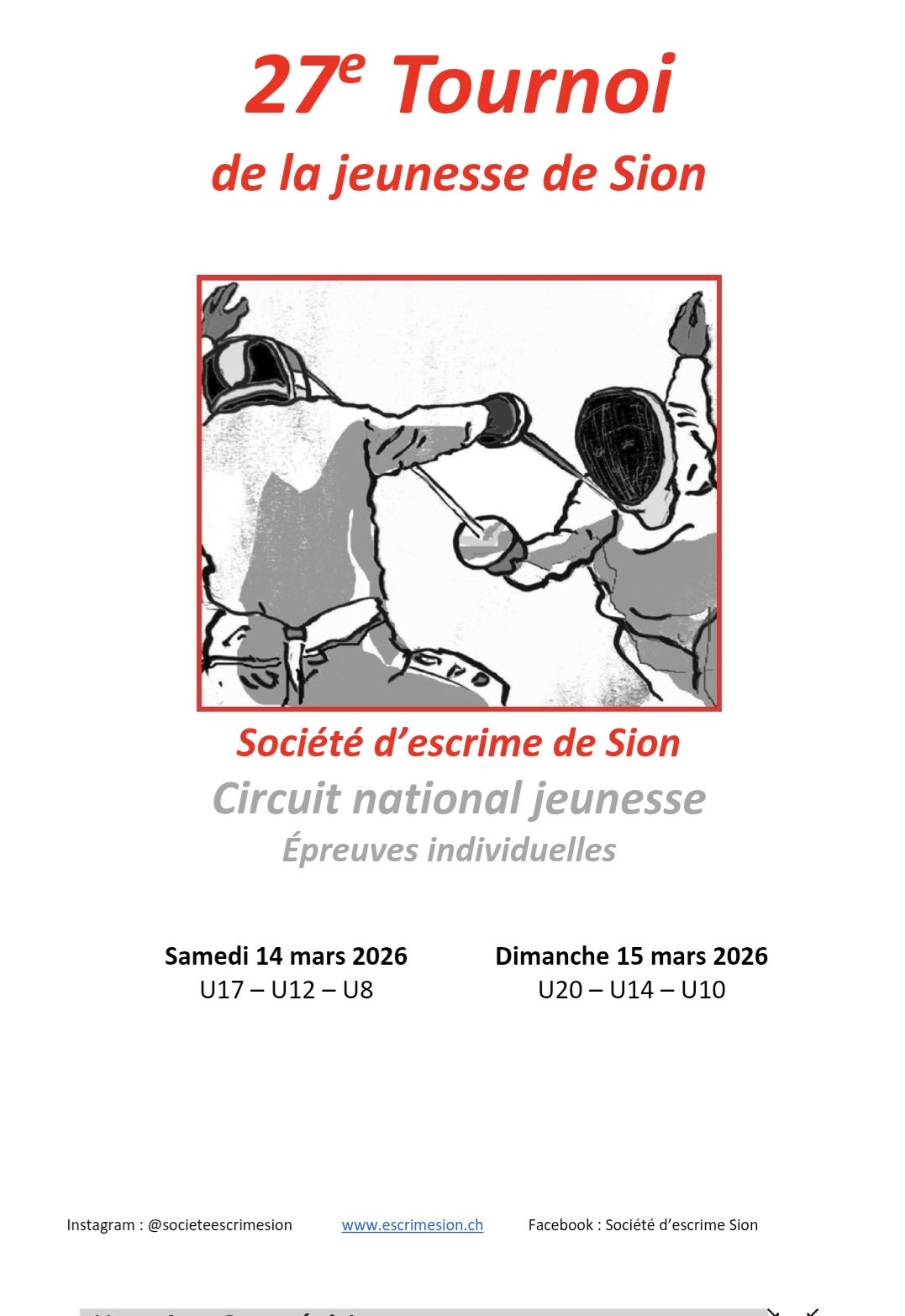 La Société d’escrime de Sion a le grand plaisir de vous accueillir pour son 27ième Tournoi de la Jeunesse à Sion le week-end du 14 & 15 mars 2026 de 8h à 18h!!