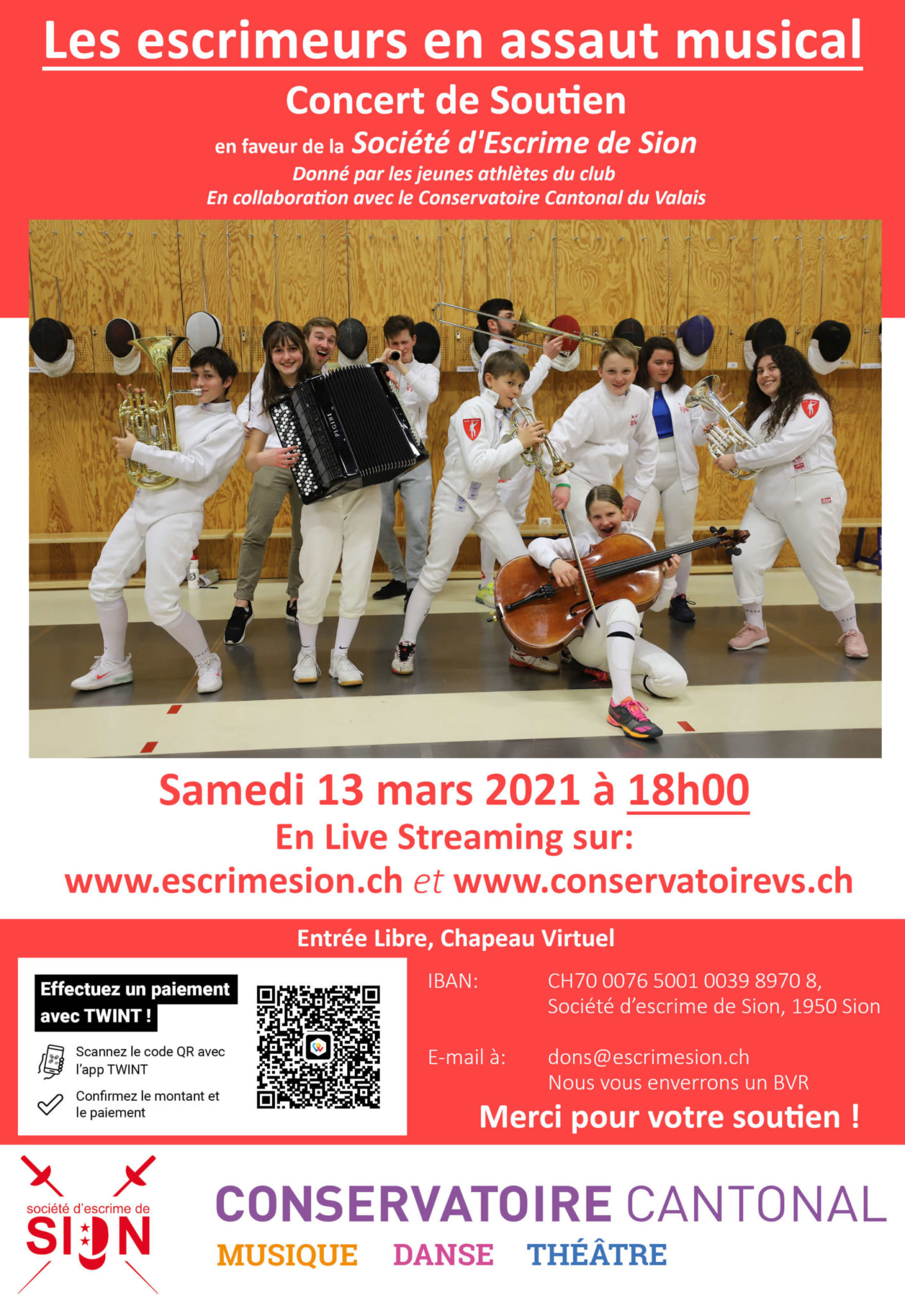 Le samedi 13 mars prochain tout un groupe d’escrimeurs-musiciens aura le plaisir de se produire seul et/ou en petit groupe dans le cadre d’un concert de Soutien (en Live Streaming sur ce site) pour notre cher Club.